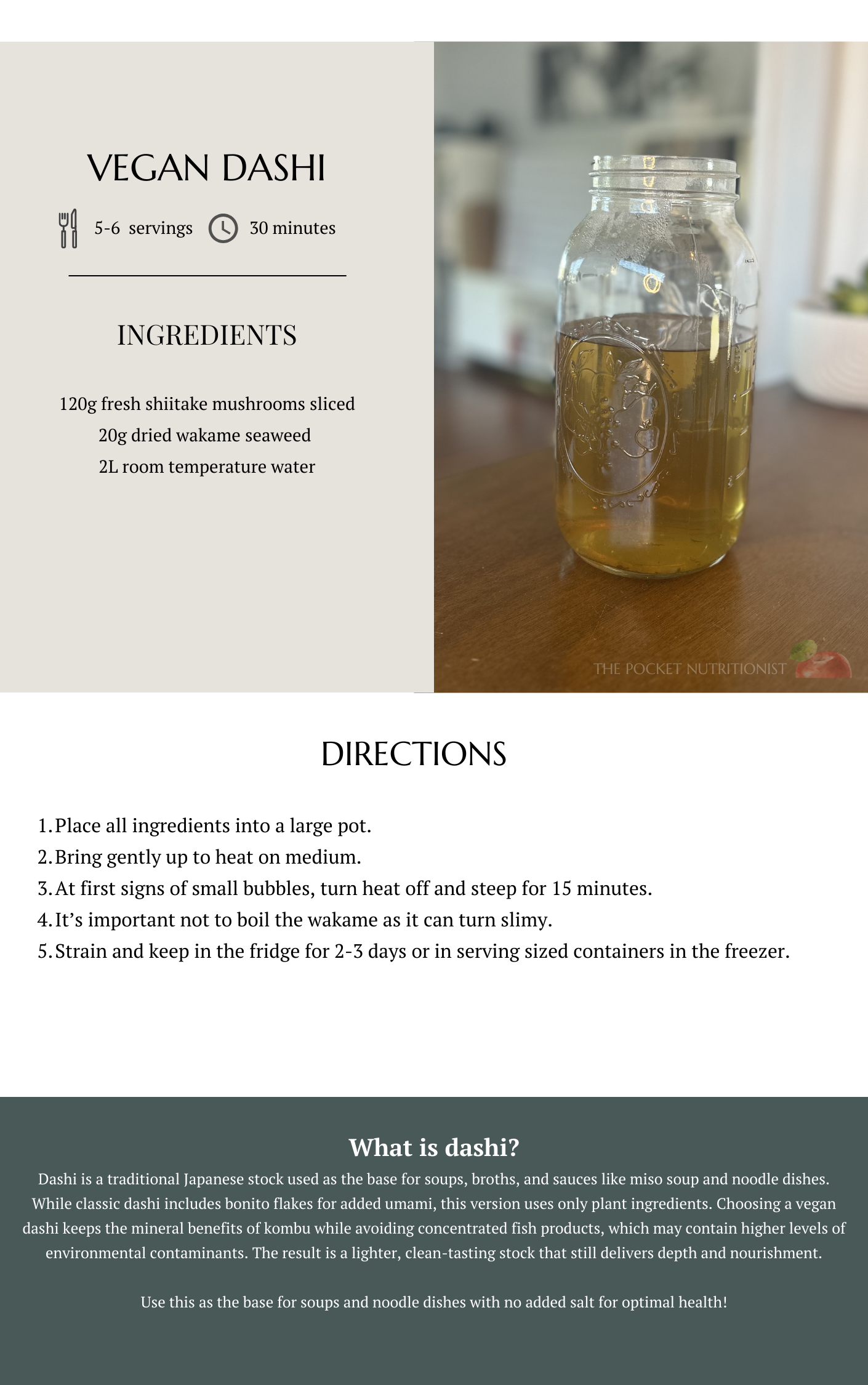 Dashi is a traditional Japanese stock used as the base for soups, broths, and sauces like miso soup and noodle dishes. While classic dashi includes bonito flakes for added umami, this version uses only plant ingredients. Choosing a vegan dashi keeps the mineral benefits of kombu while avoiding concentrated fish products, which may contain higher levels of environmental contaminants. The result is a lighter, clean-tasting stock that still delivers depth and nourishment.